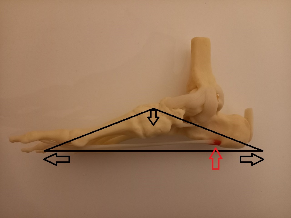 De voet is als het ware een driehoek. Bij lopen en lang staan zakt de voet iets in. De peesplaat ( plantaire fascie) aan de onderkant van de voet vangt deze kracht op zodat de driehoek niet inzakt. Zakt de voet wel in dan komt er meer rekspanning op de onderste peesplaat van de voet te staan.