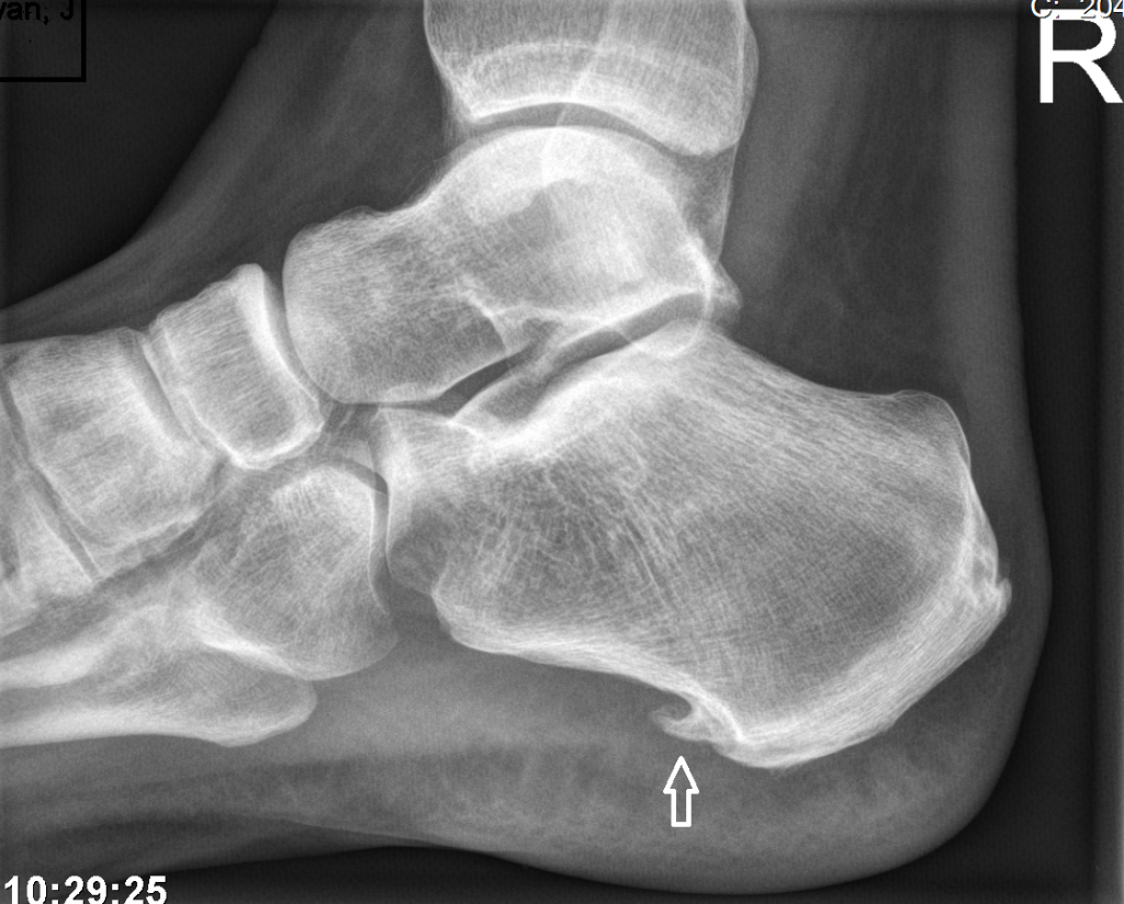 Afbeelding boven: Geïrriteerde peesplaat (fasciitis plantaris). Het lichaam kan hier een hielspoor bouwen om de pees te versterken. Hieronder ziet u een hielspoor.